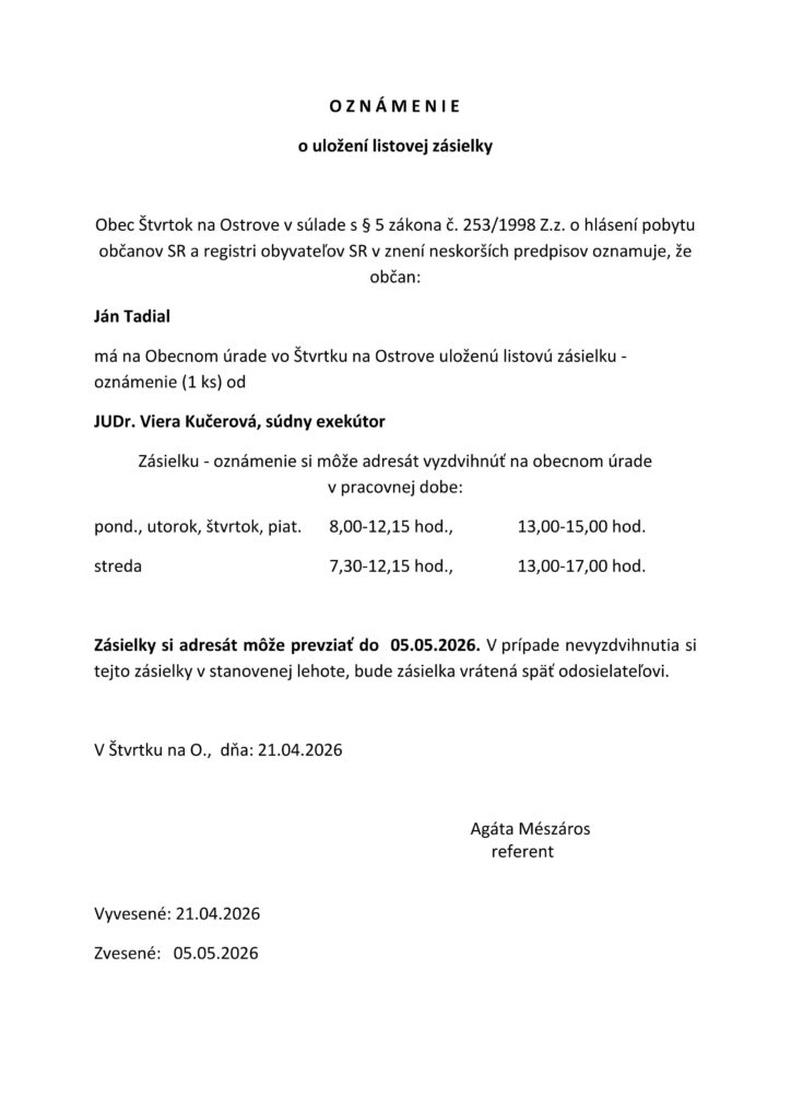 o doručenie listovej zásielky a uloženie doručenej listovej zásielky na Pošte Štvrtok na Ostrove: