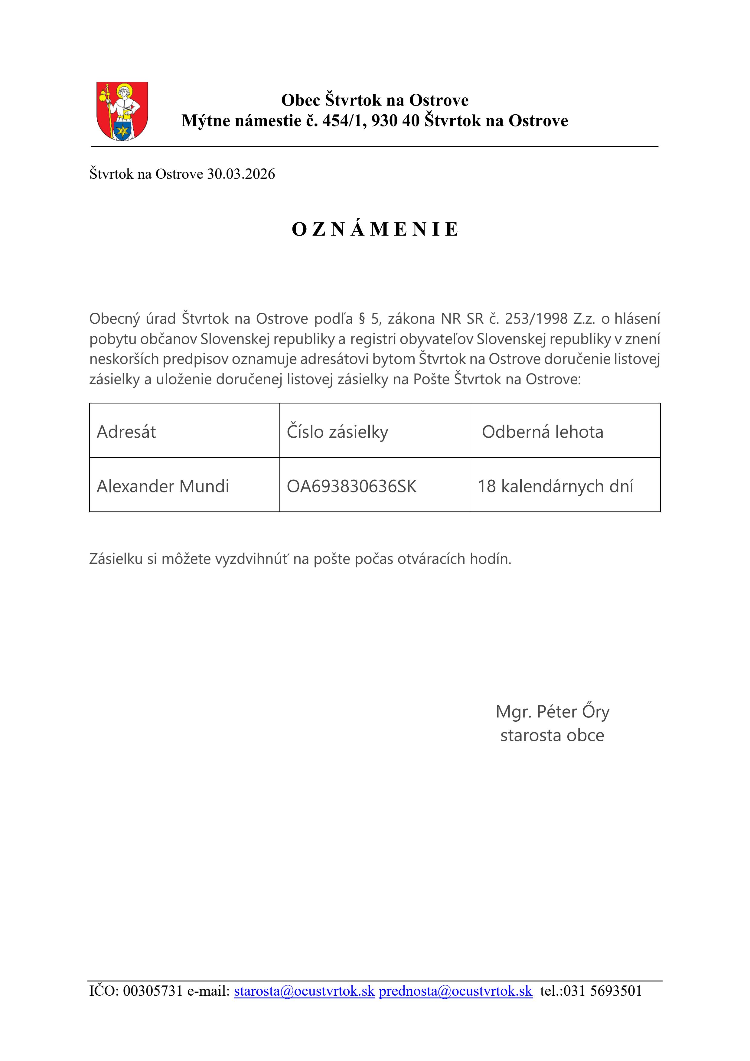 o doručenie listovej zásielky a uloženie doručenej listovej zásielky na Pošte Štvrtok na Ostrove: