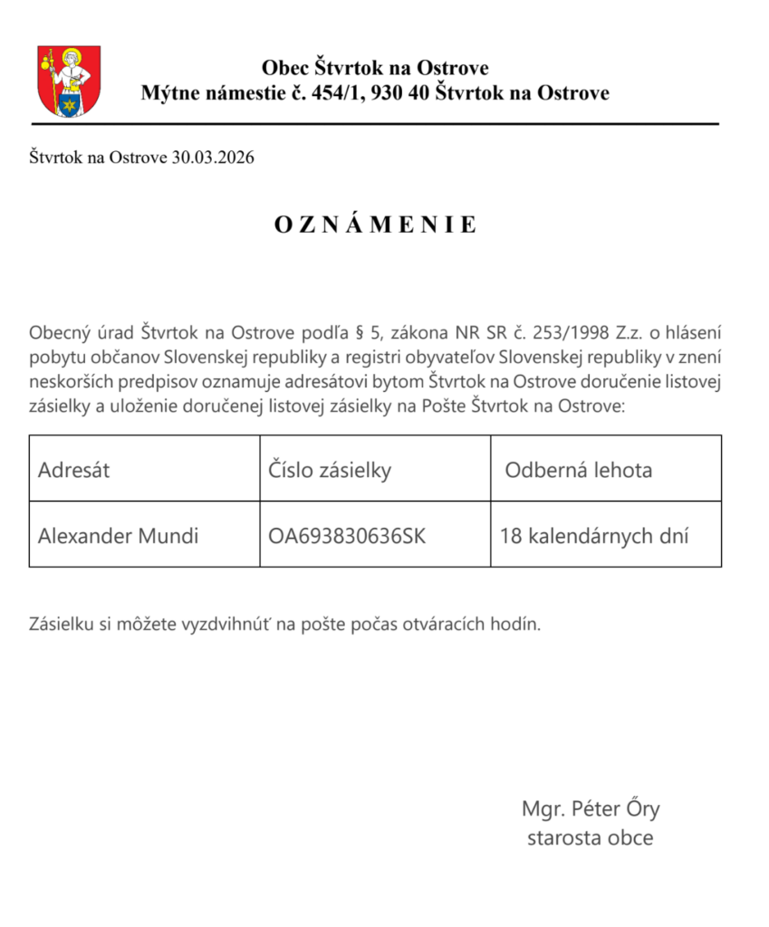 o doručenie listovej zásielky a uloženie doručenej listovej zásielky na Pošte Štvrtok na Ostrove: