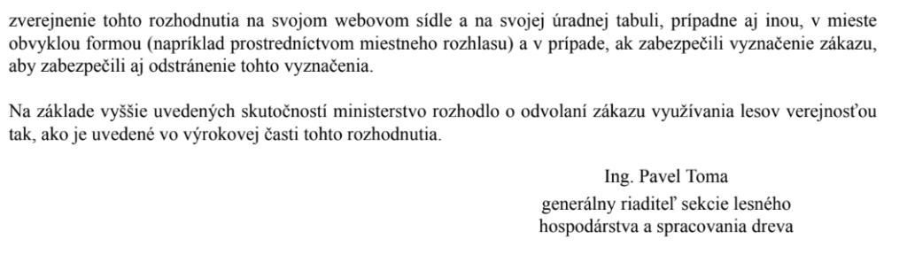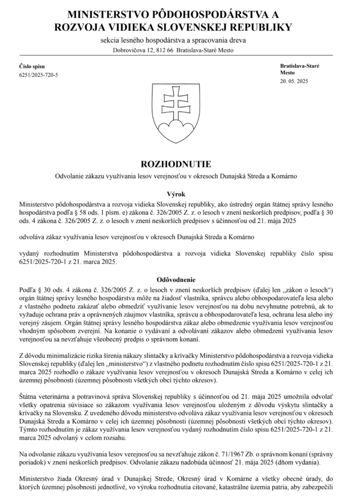 ROZHODNUTIE – Odvolanie zákazu využívania lesov verejnosťou v okresoch Dunajská Streda a Komárno