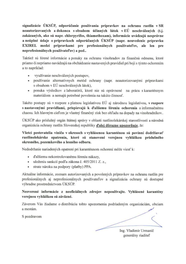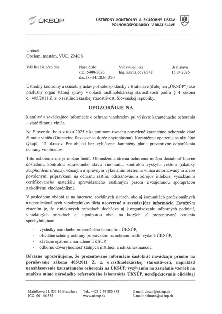 Upozornenie na klamlivé a zavádzajúce informácie o ochrane vinohradov pri výskyte karanténneho ochorenia – zlaté žltnutie viniča